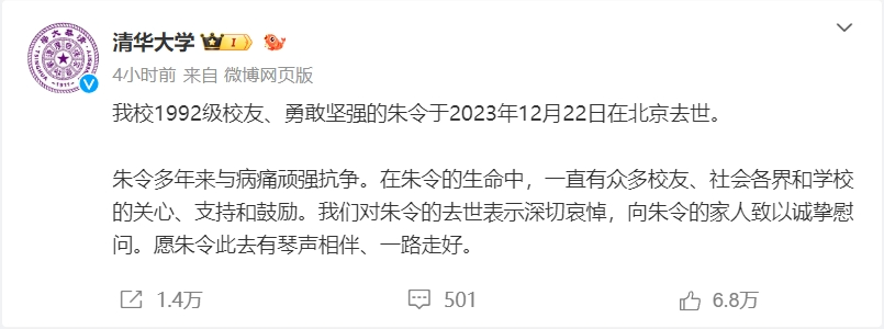 清華表示,朱令多年來與病痛頑強抗爭。在朱令的生命中,一直有眾多校友、社會各界和學校的關心、支持和鼓勵。“我們對朱令的去世表示深切哀悼,向朱令的家人致以誠摯慰問。愿朱令此去有琴聲相伴、一路走好。”