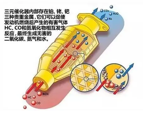 大部分汽車中都有一個(gè)配件——三元催化器,它能減少諸如一氧化碳、碳?xì)浠衔锖偷趸衔锏扔泻怏w的排放,是汽車中一個(gè)比較重要的組成部分。轉(zhuǎn)換器中的某些化學(xué)反應(yīng)會(huì)將有害物質(zhì)轉(zhuǎn)換為二氧化碳、水和氮。