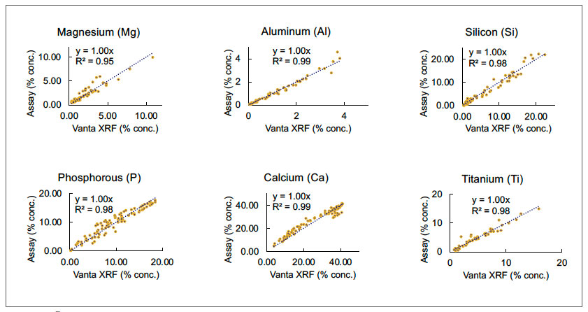 圖1.Vanta手持式XRF光譜儀在檢測由客戶提供的各種磷礦石樣品時所獲得的元素含量值與測定值高度吻合,表現了出色的性能