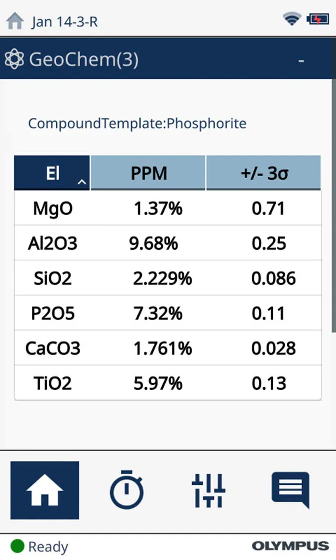 在計算元素含量的同時,奧林巴斯Vanta手持式XRF光譜儀還可以實時計算這些礦物質和化合物的含量。通過便攜式光譜分析儀易于使用的用戶界面,用戶可以將光譜儀設置為將計算出的含量報告為化合物,如圖2所示。Vanta便攜式光譜分析儀的軟件可以進行這種計算,而且只需幾秒鐘就可以完成在元素報告和化合物報告之間的切換。