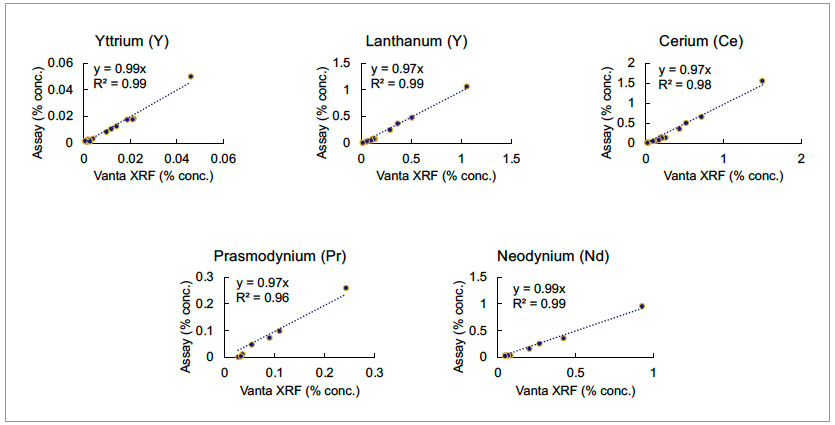 圖3. Vanta手持式XRF光譜儀在檢測由OREAS提供的標準樣品中的稀土元素時表現出很高的性能。