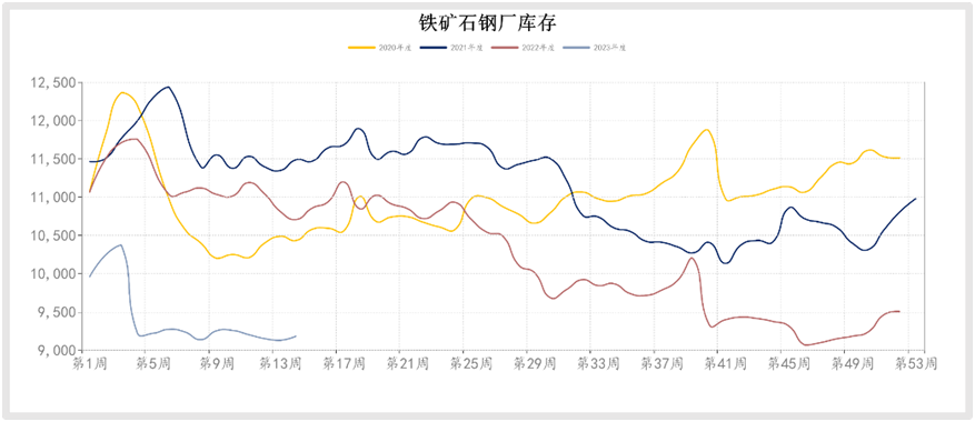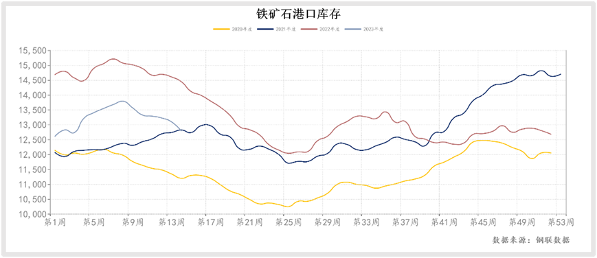 據(jù)mysteel數(shù)據(jù),4月初的一周,其統(tǒng)計的247家鋼廠高爐產(chǎn)能利用率91.2%,日均鐵水產(chǎn)量245.07萬噸,距離近五年的最高點(diǎn),即2020年8月份的253.3萬噸,只相差8.23萬噸。目前鋼廠鐵礦石總庫存與庫銷比維持低位,45港口鐵礦石庫存去庫308萬噸至1.32億噸。
