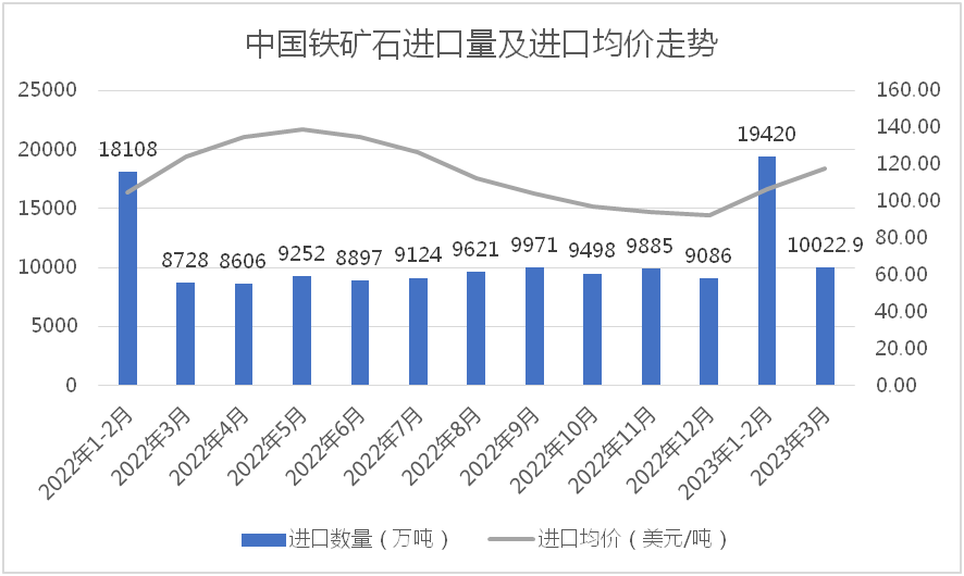 據(jù)海關(guān)總署數(shù)據(jù)顯示,2023年1-3月份,我國累計進(jìn)口鐵礦石29433.5萬噸,同比增長9.8%,進(jìn)口均價110.6美元/噸,同比下降12.0%。但值得注意的是,今年3月份,我國進(jìn)口鐵礦石量價齊升,單月進(jìn)口鐵礦石達(dá)到10022.9萬噸,同比增長14.8%,進(jìn)口均價為117.7美元/噸,較今年1-2月均價上漲11.43美元/噸,增長10.76%。