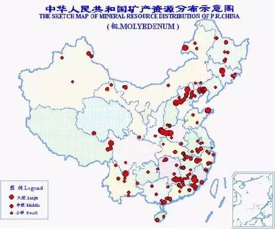中國(guó)鉬礦資源豐富,總保有儲(chǔ)量鉬840萬(wàn)噸,居世界第2位。探明儲(chǔ)量的礦區(qū)有222處,分布于28個(gè)省(區(qū)、市)。以河南省鉬礦資源為最豐富,鉬儲(chǔ)量占全國(guó)總儲(chǔ)量的30.1%。
