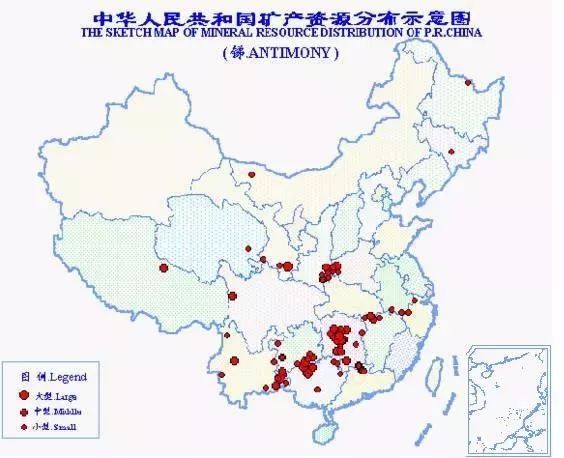 中國(guó)是世界上銻礦資源最為豐富的國(guó)家。總保有儲(chǔ)量銻278萬(wàn)噸,居世界第1位。已探明儲(chǔ)量的礦區(qū)有111處,分布于全國(guó)18個(gè)省(區(qū)),以廣西銻儲(chǔ)量為最多,約占全國(guó)的41.3%;其次為湖南、云南、貴州、甘肅、廣東等省。
