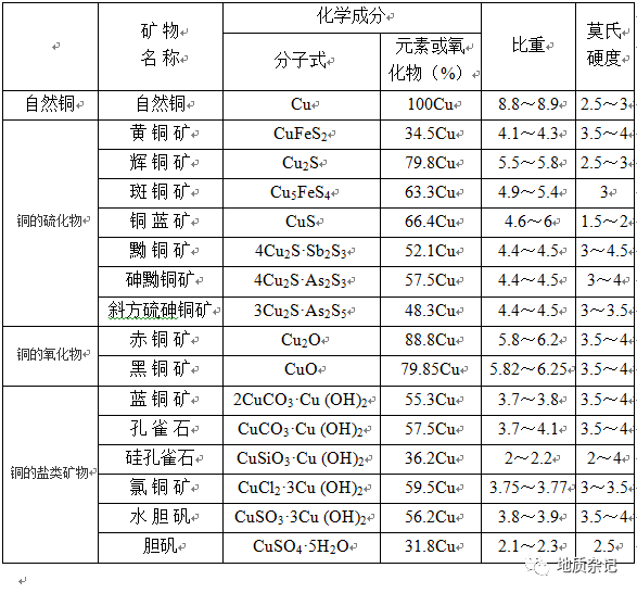 表 銅礦物化學成分及其比重