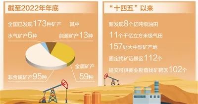 一組數(shù)字揭示成果:截至2022年年底,全國(guó)已發(fā)現(xiàn)能源礦產(chǎn)13種,金屬礦產(chǎn)59種,非金屬礦產(chǎn)95種,水氣礦產(chǎn)6種;“十四五”以來(lái),新發(fā)現(xiàn)8個(gè)億噸級(jí)油田、11個(gè)千億立方米級(jí)氣田、157處大中型礦產(chǎn)地,圈定找礦遠(yuǎn)景區(qū)112個(gè),提交可供商業(yè)勘查找礦靶區(qū)102個(gè)。“從目前情況看,新一輪找礦突破戰(zhàn)略行動(dòng)進(jìn)展順利,時(shí)間過半、任務(wù)過半,預(yù)期能夠完成既定目標(biāo)。”自然資源部地質(zhì)勘查管理司司長(zhǎng)熊自力說(shuō)。