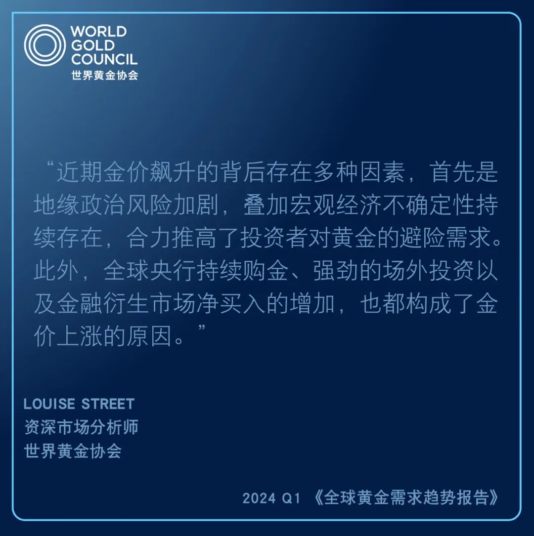 世界黃金協(xié)會(huì)資深市場分析師路易斯·斯特里特(Louise Street)分析稱:“近期金價(jià)飆升的背后存在多種因素,首先是地緣政治風(fēng)險(xiǎn)加劇,疊加宏觀經(jīng)濟(jì)不確定性持續(xù)存在,合力推高了投資者對黃金的避險(xiǎn)需求。此外,全球央行持續(xù)購金、強(qiáng)勁的場外投資及金融衍生市場凈買入的增加,也都構(gòu)成了金價(jià)上漲的原因。東西方投資者的行為趨勢正在發(fā)生轉(zhuǎn)變。