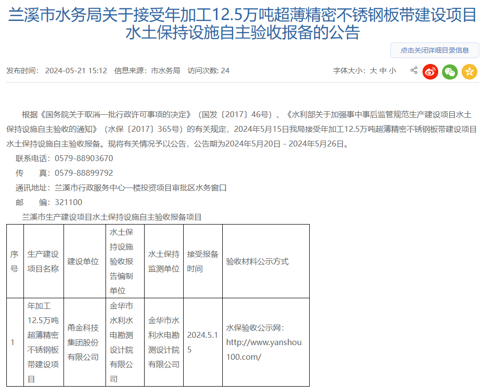 5月21日,蘭溪市水務局接受浙江甬金科技集團股份有限公司年加工12.5萬噸超薄精密不銹鋼板帶建設項目水土保持設施自主驗收報備并對外進行公告,公告期:2024年5月20日-2024年5月26日。