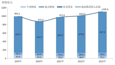 年報顯示,從2023年全國非油氣地質勘查投入資金來源看,中央財政為46.23億元,占總量的23%,同比增長10.6%;地方財政為85.04億元,占總量的42.4%,同比增長0.7%;社會資金為69.45億元,占總量的34.6%,同比增長15.5%。從資金投向看,礦產勘查為117.56億元,占總量的58.5%;基礎地質調查為22.23億元,占總量的11.1%;水文地質、環境地質與地質災害調查評價為38.33億元,占總量的19.1%;地質科技與綜合研究為20.28億元,占總量的10.1%;地質資料服務與信息化為2.32億元,占總量的1.2%。