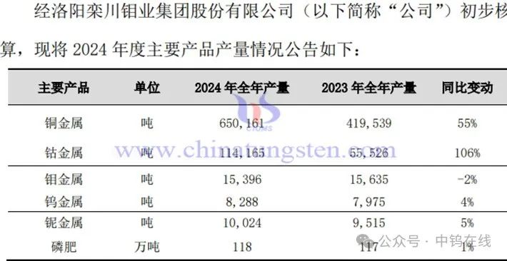 洛陽鉬業(yè)2024年主要產(chǎn)品產(chǎn)量情況公告