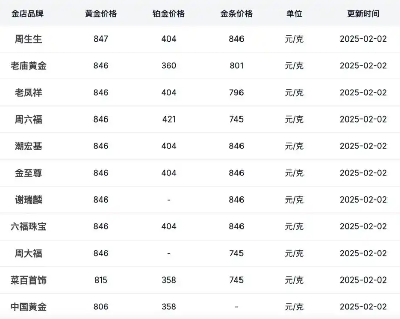 水貝金家網的數據顯示,周生生當日公開的境內價格最高,為847元/克,周大福、老廟黃金、六福珠寶、老鳳祥、潮宏基、謝瑞麟等黃金珠寶品牌公布的境內足金首飾價格均為846元/克。
